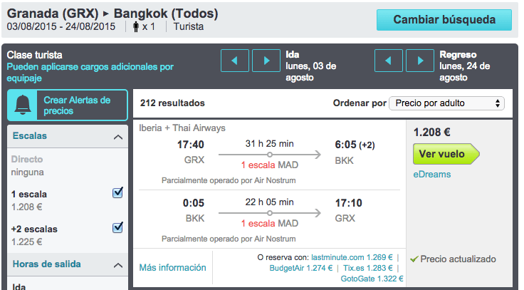 A veces las fechas de viaje no son inamovibles. Si sus fechas de viaje preferidas tienen cierto margen de maniobra, las fechas flexibles le mostrarán vuelos hasta 3 días antes/después de sus fechas preferidas. De este modo, puede ver si salir un día o dos antes le permitirá encontrar una mejor oferta. También puede seleccionar las opciones de búsqueda flexible de «fin de semana» o «mes» para ampliar su rango de búsqueda y encontrar el precio más barato que le convenga.