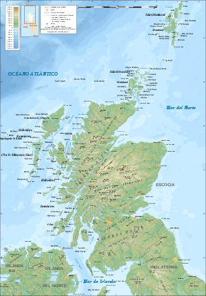 Las Highlands del norte son bastante montañosas y contienen muchos picos elevados. Las Highlands están divididas por el valle de Glen Mor, situado en el centro-norte de Escocia. En la parte sureste de Glen Mor se encuentran las montañas de Grampian, en las que destaca el monte Ben Nevis, que se eleva a 1.343 m y es el punto más alto de Escocia. En Escocia hay más de 790 islas. Los principales grupos de islas son las Hébridas interiores y exteriores, las Orcadas y las Shetland.