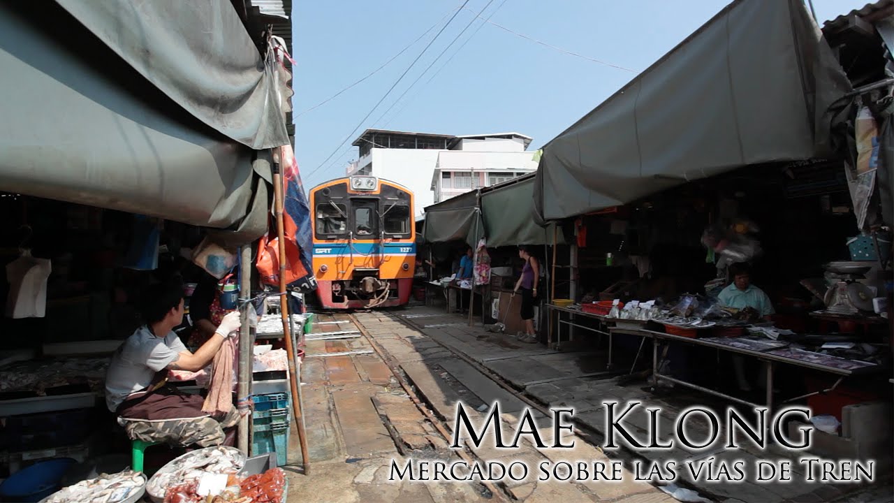 Ocho veces al día, un tren pasa directamente por el centro del mercado. Cuando el tren se acerca, los vendedores que se alinean a ambos lados de las vías apartan algunas de sus mesas y productos de las vías y bajan sus paraguas para dejar pasar el tren.